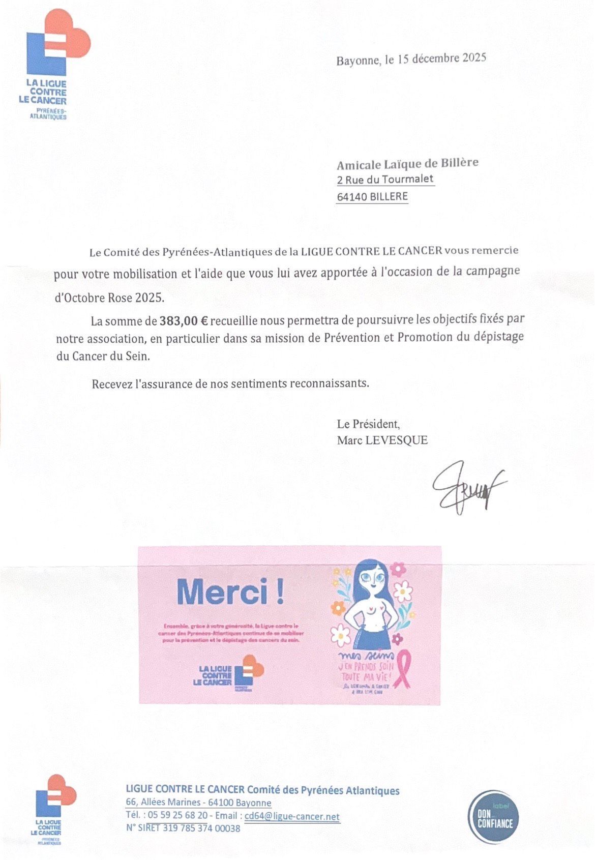L’Amicale Laïque de Billère est fière de l’engagement et de la mobilisation de ses adhérents en faveur de grandes causes de santé publique.